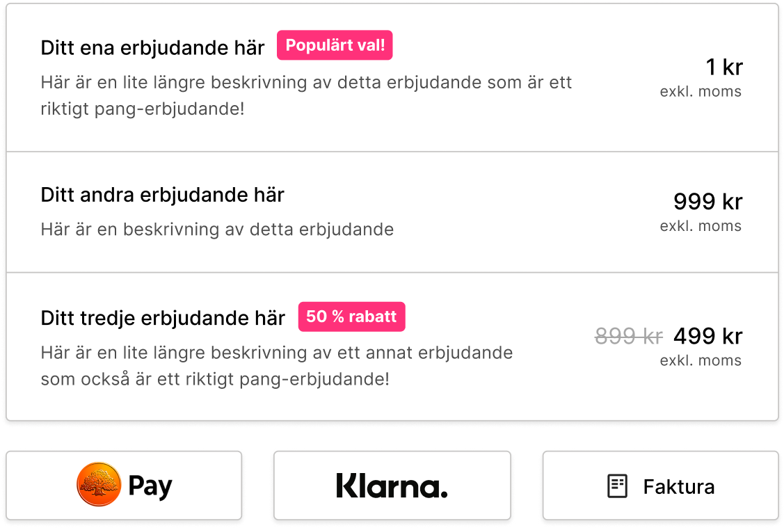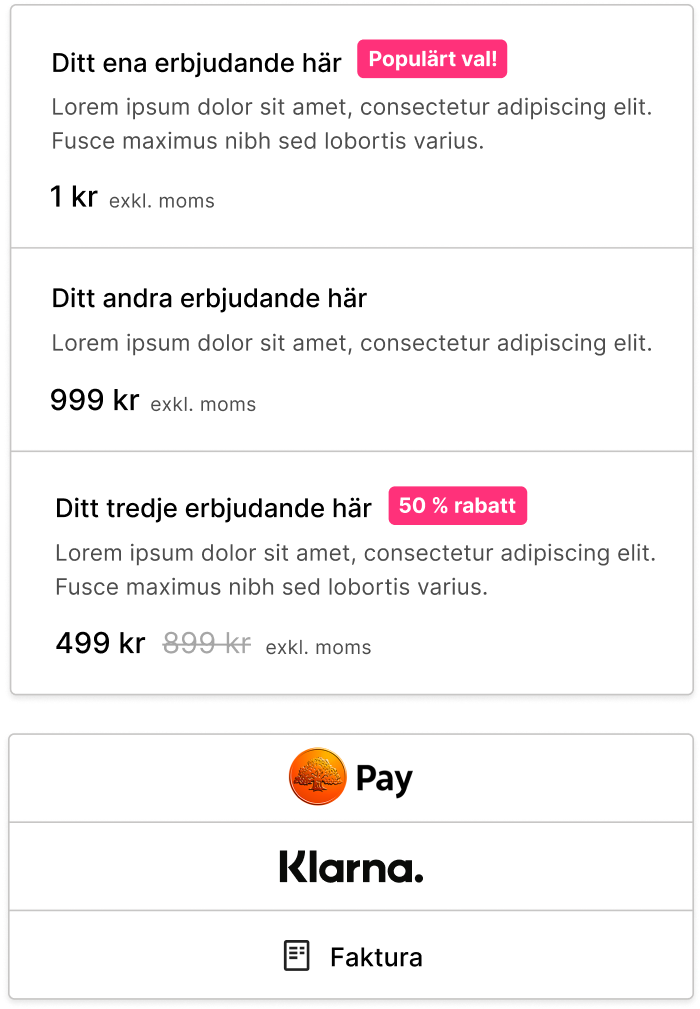 - Skräddarsy checkouter för dina prenumerations-erbjudanden, både generella köpsidor och tillfälliga checkout:er för kampanjer